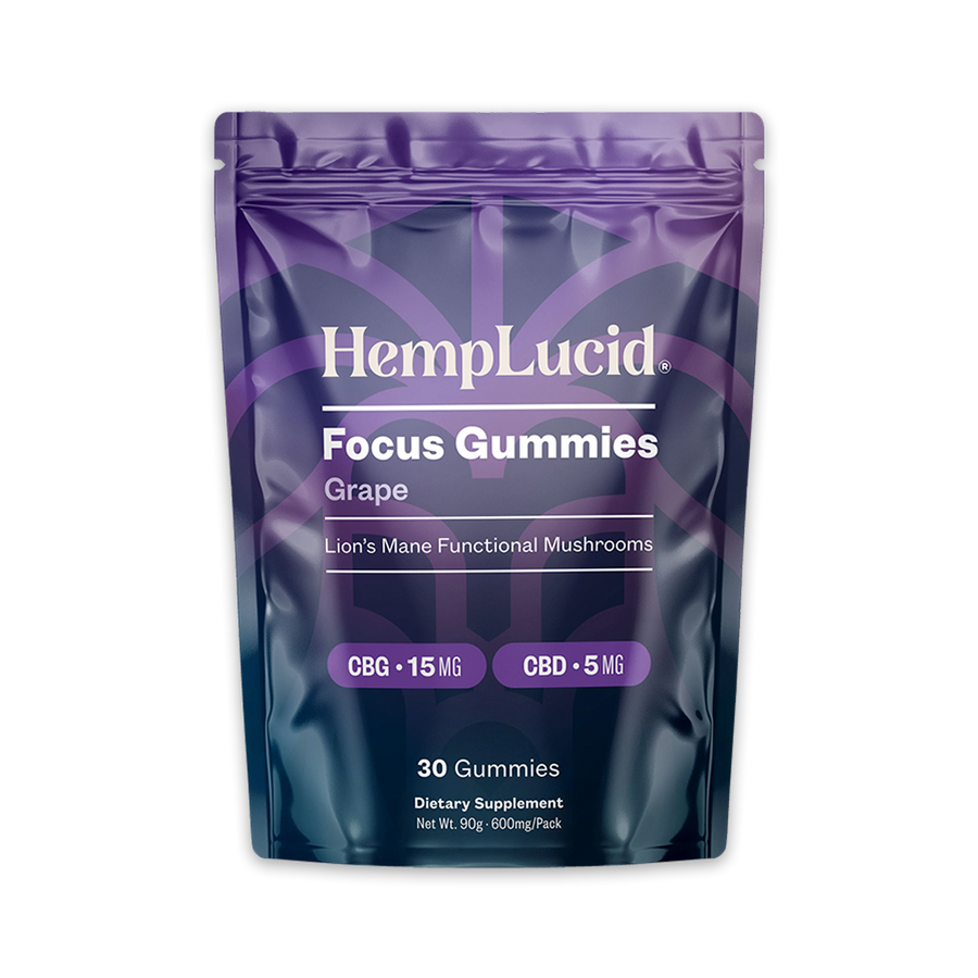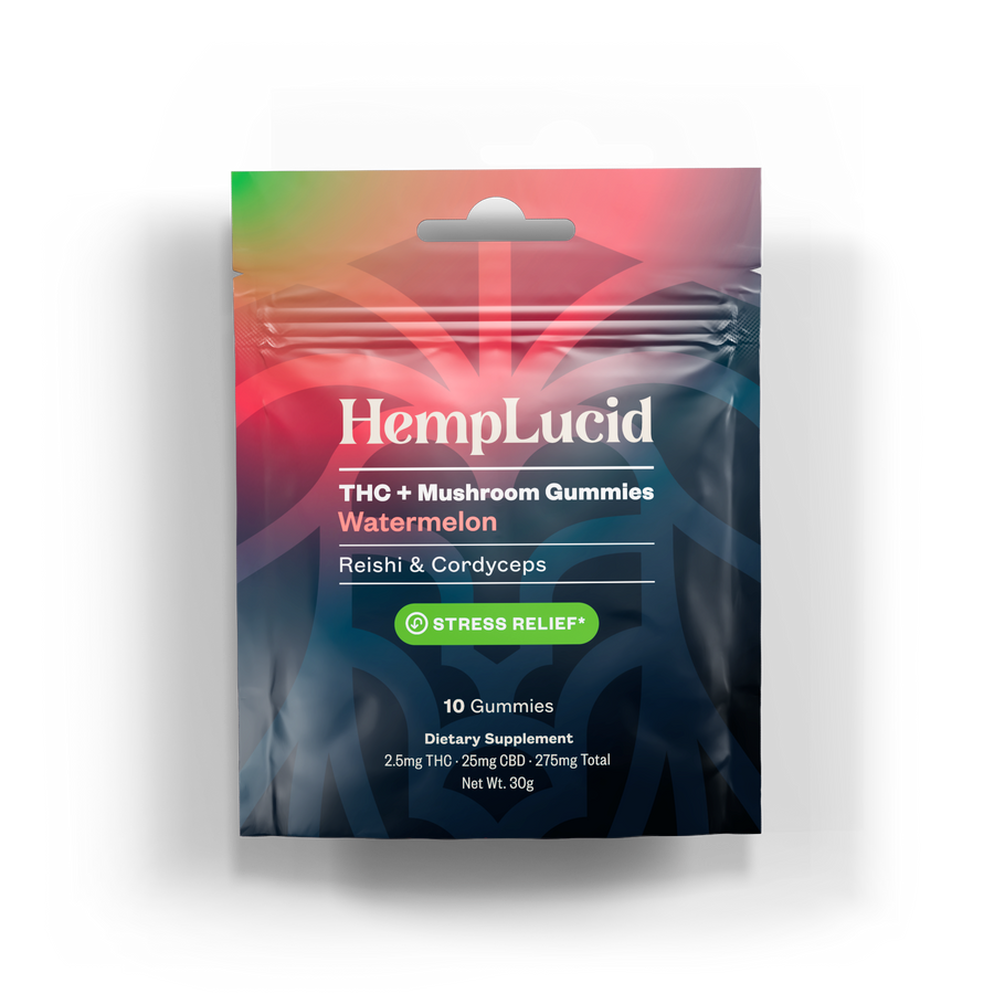 We also have stress mushroom THC gummies called delta 8 watermelon gummies, and focus mushroom CBD gummies, which contain Lion's mane mushrooms plus green tea, CBD, and CBG (another compound with no psychotropic effects) but no THC.