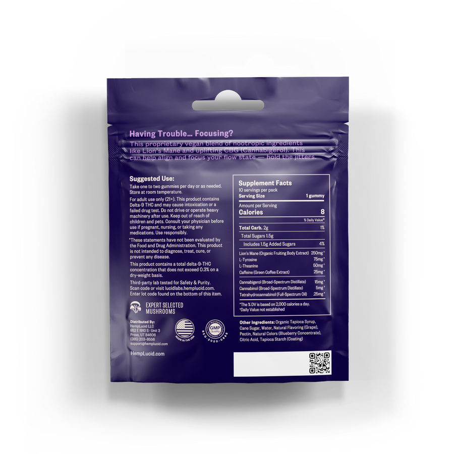 Made with natural ingredients, these Focus Gummies help you feel clear and lucid, not anxious or jittery.