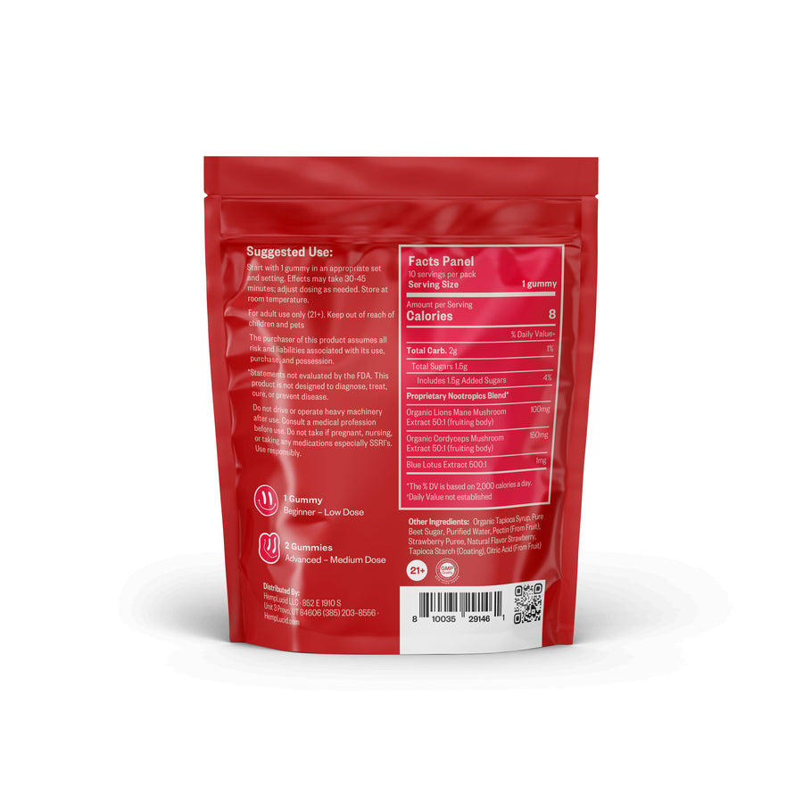 Health-Conscious Ingredients for Cognitive and Mood Support HempLucid Microdosed Mushroom Gummies are made with organic tapioca syrup, beet sugar, purified water, pectin, natural fruit concentrate, natural berry flavoring, and a blue lotus nootropic blend. Free from artificial flavors, our commitment to natural, high-quality ingredients supports a healthy, holistic lifestyle.